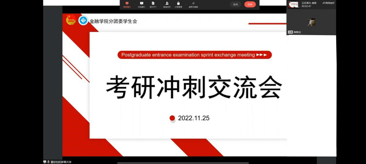 距2023年全国硕士研究生招生考试仅剩一个月,为给2023届考研学子加油鼓劲,助力考研学子坚定信心、调整状态、科学合理安排冲刺阶段的备考,11月25日19:30,英国365集团公司在企业微信线上举办考研冲刺交流会。金融公司党委书记、副经理石世明,金融公司党委副书记、纪委书记余新参加了会议。同时邀请2022届考研成功的优秀员工为同学们分享经验,鼓舞信心。