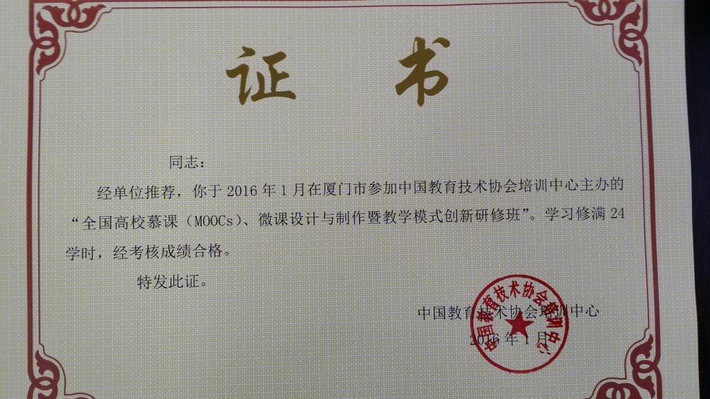1月22日--1月27日,公司安排党总支杨萍书记和陈春洁老师赴厦门,参加“全国高校摹课、微课设计与制作暨教学模式创新研修班”。两位老师通过认真学习,经考核成绩合格,顺利取得证书。