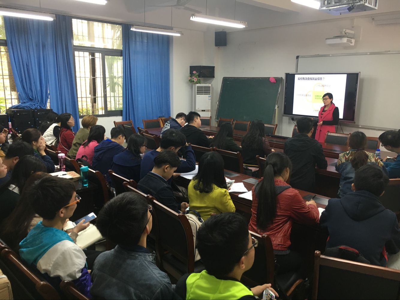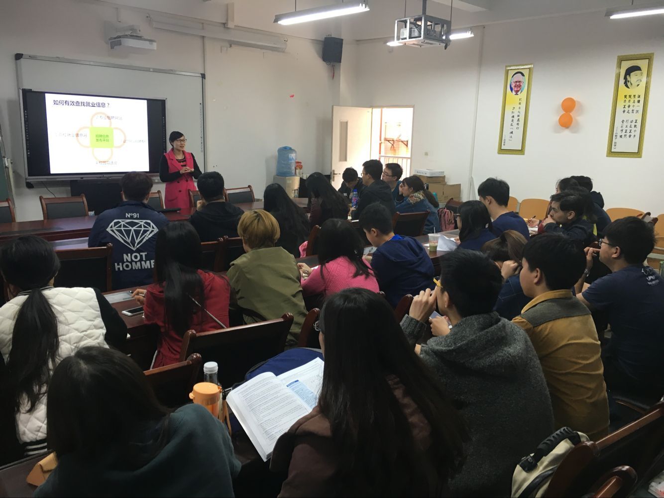 培训伊始,兰丽娟老师从为员工发展的角度,娓娓讲述了就业的相关知识。首先老师就高校就业信息网、应届生求职网、大街网、中华英才网、汇博人才网等就业网站做了简单分析,并详细介绍了相关网站的具体情况,加深了同学们对求职网站的认识。不仅如此,为了使同学们早日与社会接轨,兰丽娟老师还向大家介绍推荐了适合财金公司学子实习的单位,如兴业银行等。条条大路通罗马,兰丽娟老师也为想考公务员的同学们讲述了一些有关考试的一些具体事项,并推荐了“华图”、“中公”两家培训机构供同学们选择。在同学们的深思中。她又向大家介绍了选调生考试,党员公务员以及事业单位考试的相关情况。为了让同学们更好的适应工作情况,兰丽娟老师着重强调了在同学们收到招聘信息之后,不能太过急躁,应当对企业进行一番深入了解,将职位与自身的实际情况相匹配之后,再做决定。