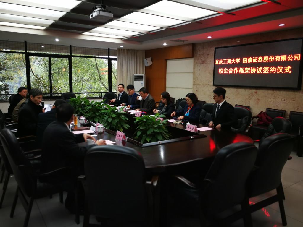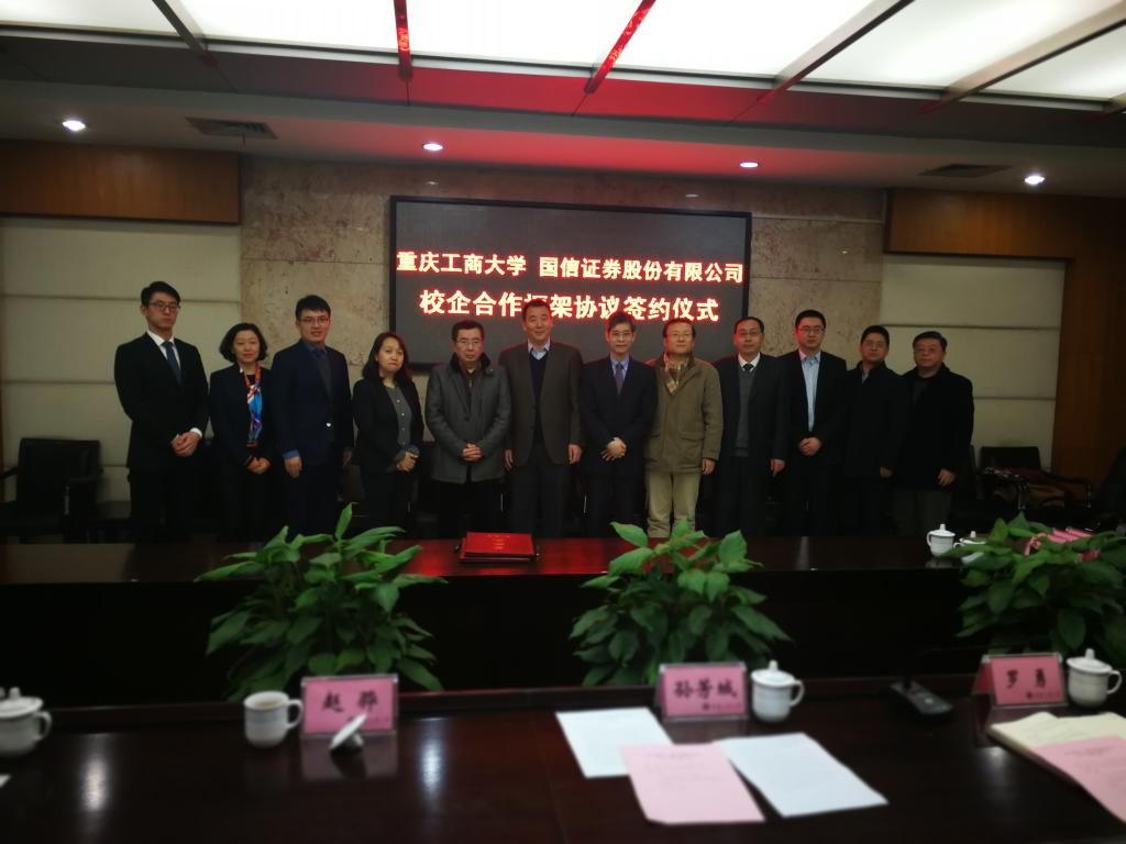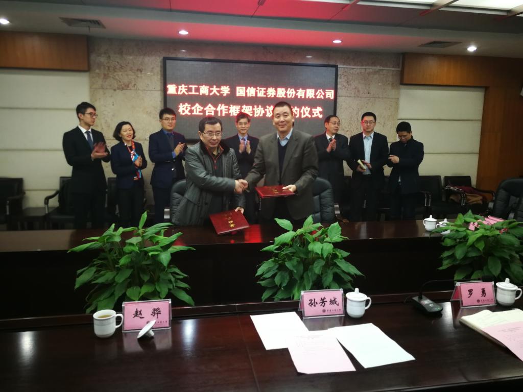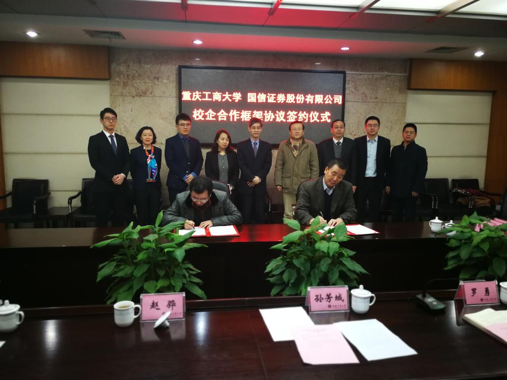 1月18日下午,为加快贯彻落实《重庆市以大数据智能化为引领的创新驱动发展战略行动计划(2018-2020年)》等文件精神,英国365集团公司与国信证券股份有限公司在厚德楼3019会议室签订战略合作协议。国信证券股份有限公司副总裁徐敬耀、投研总监陈俊杰、重庆分公司总经理高莉、总经理助理李颖、业管部负责人陈哲,公司董事长孙芳城教授、副董事长赵骅教授、党政办、教务处以及财政英国365集团公司主要负责人出席了签约仪式。仪式由公司党政办主任罗勇教授主持。
