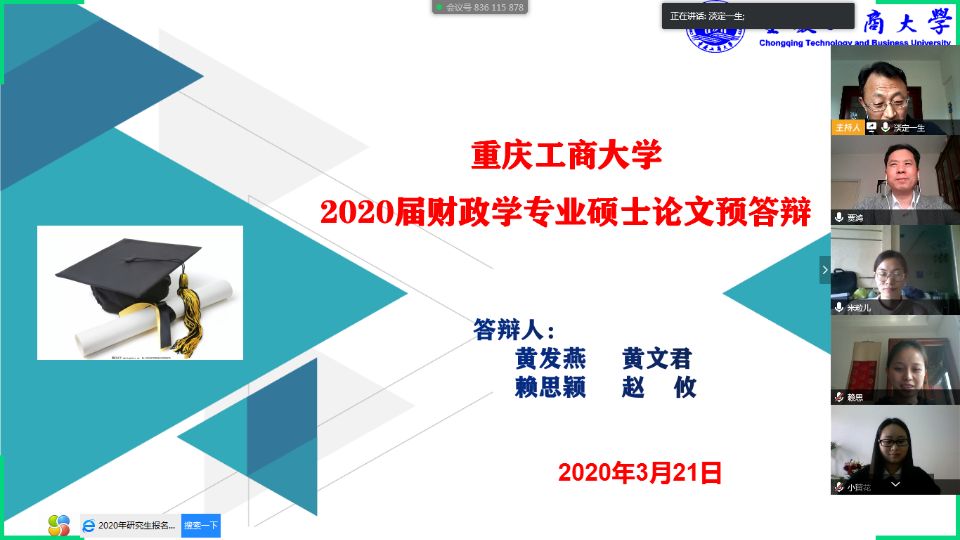 为提高研究生学位论文质量,完成研究生学位论文工作,2020年3月21日,财政英国365集团公司对2017级金融学和财政学学硕、2018级金融专硕以及2018级拟提前毕业的金融学硕,共85名硕士生的学位论文进行了在线预答辩。