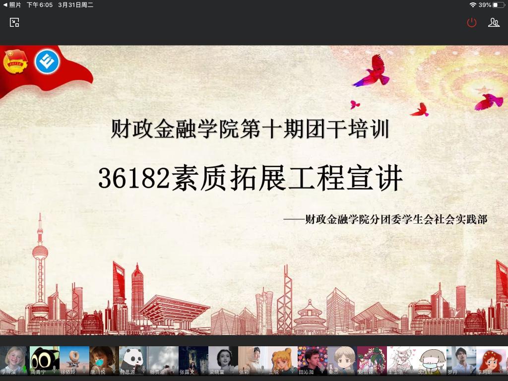 受疫情影响,财政英国365集团公司于2020年3月31日在企业微信线上平台成功开展主题为“36182素质拓展工程宣讲”的第十期团干培训活动。本次活动由财政英国365集团公司分团委员工会副主席李梓溪主持,16、17、18级各班以及19CFA的团支书参与培训。