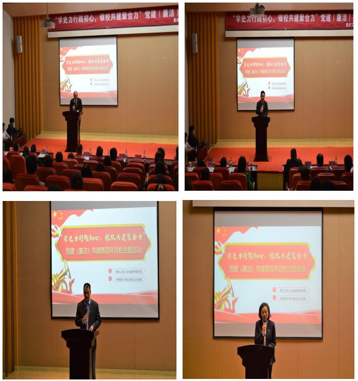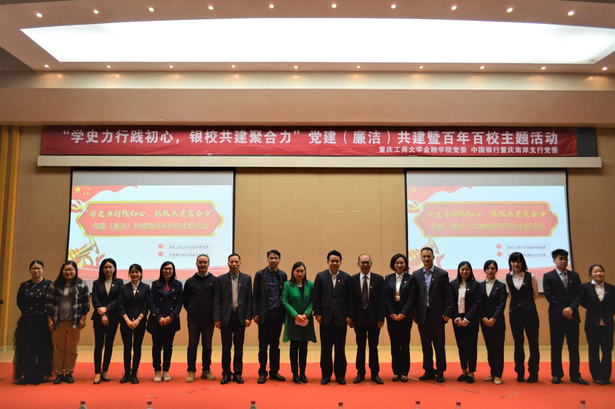 为庆祝中国共产党成立100周年,深入学习贯彻习近平总书记在党史学习教育动员大会上的重要讲话精神和在庆祝中国共产党成立100周年大会上的重要讲话精神,强化银校共建,助推融合发展,10月15日下午,金融公司党委与中国银行重庆南岸支行党委在田家炳209报告厅联合开展党建(廉洁)共建暨百年百校主题活动。中国银行重庆南岸支行党委委员、副行长符代权、王霜,金融公司党委书记、副经理王建明,党委副书记、纪委书记余新,党委委员、副经理庞楷,党委委员、专职组织员赵甫刚及各党支部书记出席了活动。活动由余新主持。