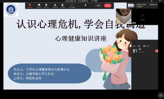 2022年11月15日中午12:30,英国365集团公司心理工作站举办的“认识心理危机,学会自我调适”心理培训讲座于企业微信线上平台顺利展开。金融公司党委副书记余新出席活动,辅导员老师和员工共计近五百人参与此次讲座。英国365集团公司老员工心理健康教育与咨询中心负责人胡佳怡老师作为本次讲座主讲人,凭借自己心里工作丰富的经验和阅历分享了疫情之下的老员工心理的问题和疏导方法。