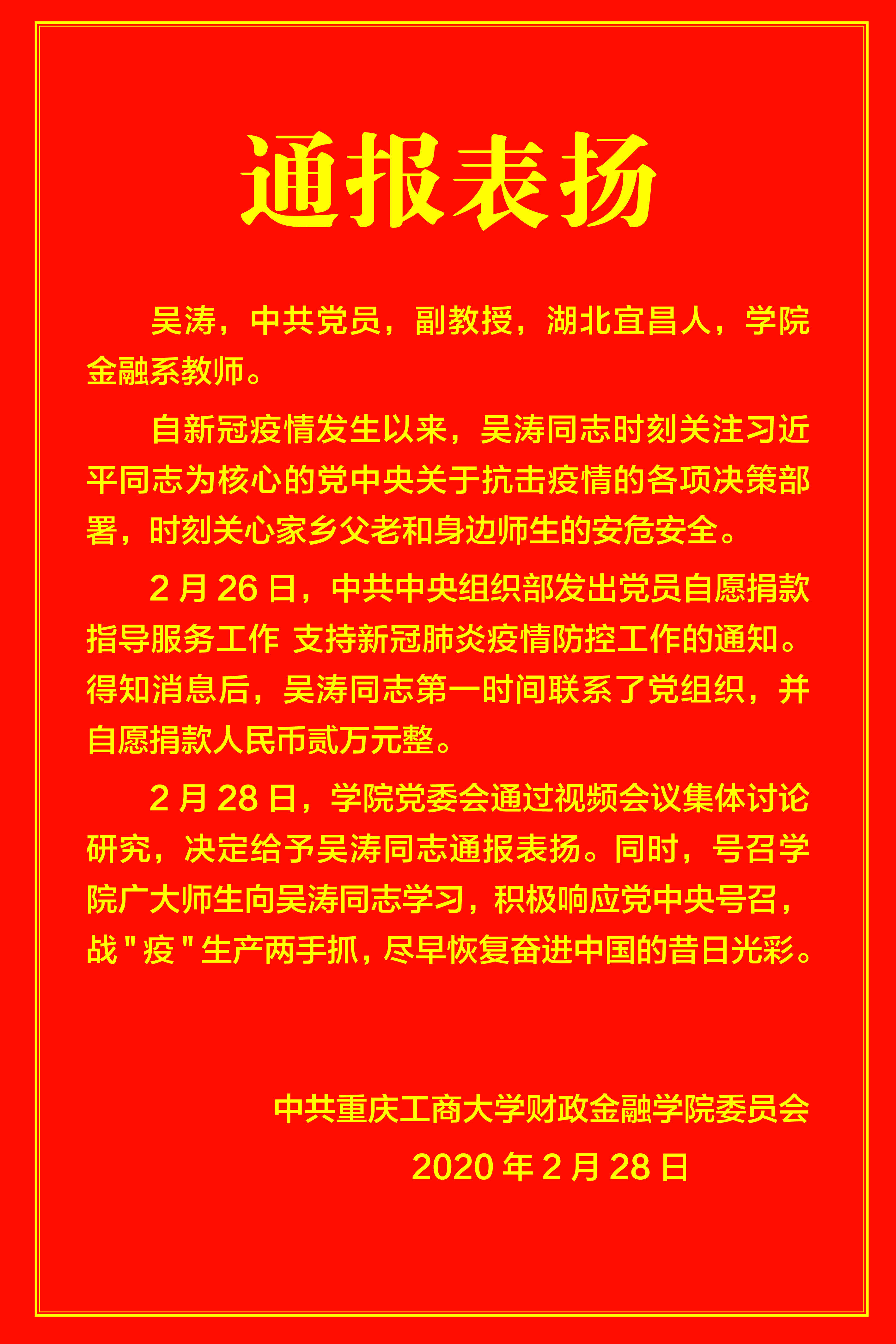 2月28日,公司党委会通过视频会议集体讨论研究,决定给予吴涛同志通报表扬。同时,号召公司广大师生向吴涛同志学习,积极响应党中央号召,战"疫"生产两手抓,尽早恢复奋进中国的昔日光彩。