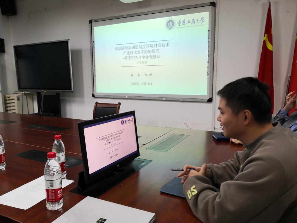 2018级金融学硕阳杨同学宣讲了工作论文《西部陆海新通道制度环境对高技术产业技术效率影响研究--基于SFA与中介变量法》。