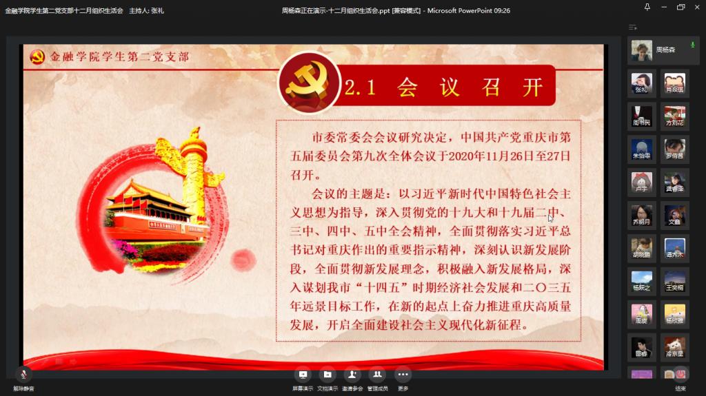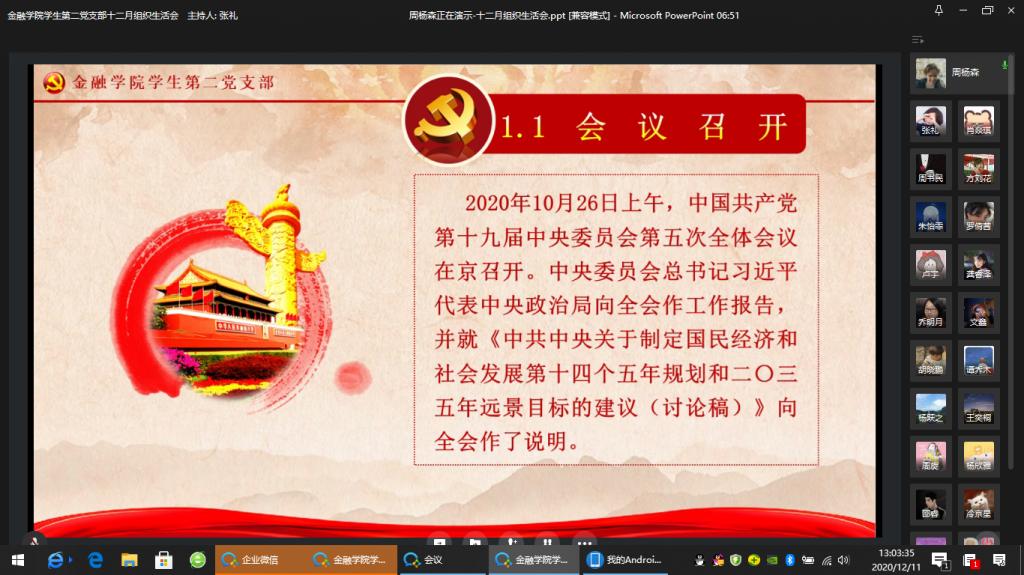为全面贯彻落实党的十九届五中全会精神,进一步加强党员同志们的政治思想觉悟,英国365集团公司员工第二党支部于2020年12月11日在企业微信举行了十二月组织生活会。出席本次大会的成员有英国365集团公司员工第二支部书记乔明月老师和支部全体党员同志。本次会议主要由党员同志领学新精神、分享心得体会和总结发言三个环节构成。