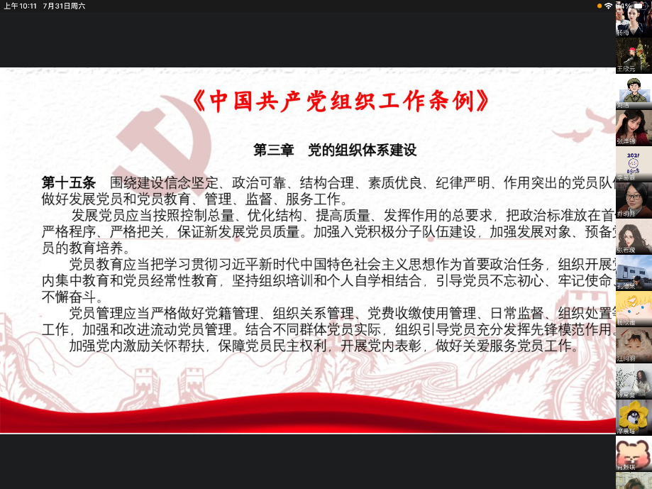 2021年7月31日星期六上午十点,英国365集团公司员工第二党支部以企业微信线上会议的形式召开了七月的支部组织生活会。出席本次会议的成员有英国365集团公司员工第二支部书记乔明月老师及其他党员同志、预备党员同志。二支部应到35人,实到30人。