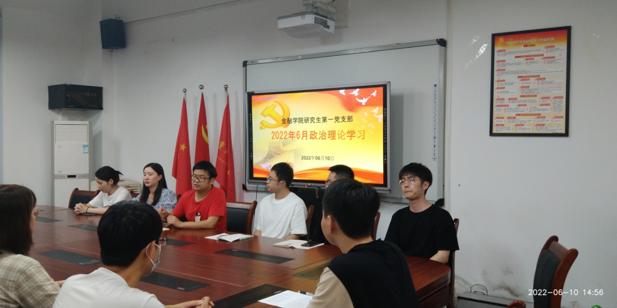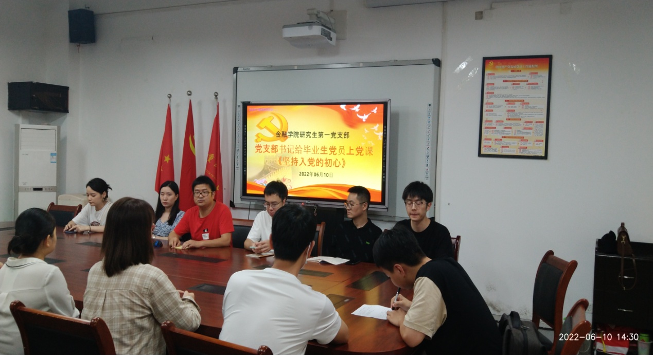 下午13:00点整,13名毕业生党员同志和新发展的6名预备党员一起参加了金融公司党委组织的(重温)入党宣誓活动。宣誓完毕后全体党员在田家炳317会议室聆听了支部书记杨老师给毕业生党员开展的讲党课活动,党课的题目是《坚持入党初心》,杨书记主要谈了三点:第一点是关于党的初心是什么?即如习总书记所说:“为中国人民谋幸福,为中华民族谋复兴”;第二点是我们在座的研究生党员的初心是什么?那就是要义无反顾肩负起实现中华民族伟大复兴的历史使命,坚持“人民利益高于一切”,全心全意为人民服务;第三点是如何坚持初心?杨宁老师认为首先必须要不断学习党的先进理论知识,以党的先进思想和理论来武装自身的头脑,从而摒弃消极思想的侵袭,不断夯实和提高自身的理想信念,保持党性。其次是在实际的工作中不断提升自身的业务水平和工作能力,增强自身为党、为国家、为社会、为人民服务的能力和实绩,将思想与行动辩证统一起来。最后是要注重个人的生活作风,遵纪守法,坚持良好的家庭和社会责任感,保持和人民群众的血肉联系,坚守底线思维,提升党在人民群众中的影响和形象。