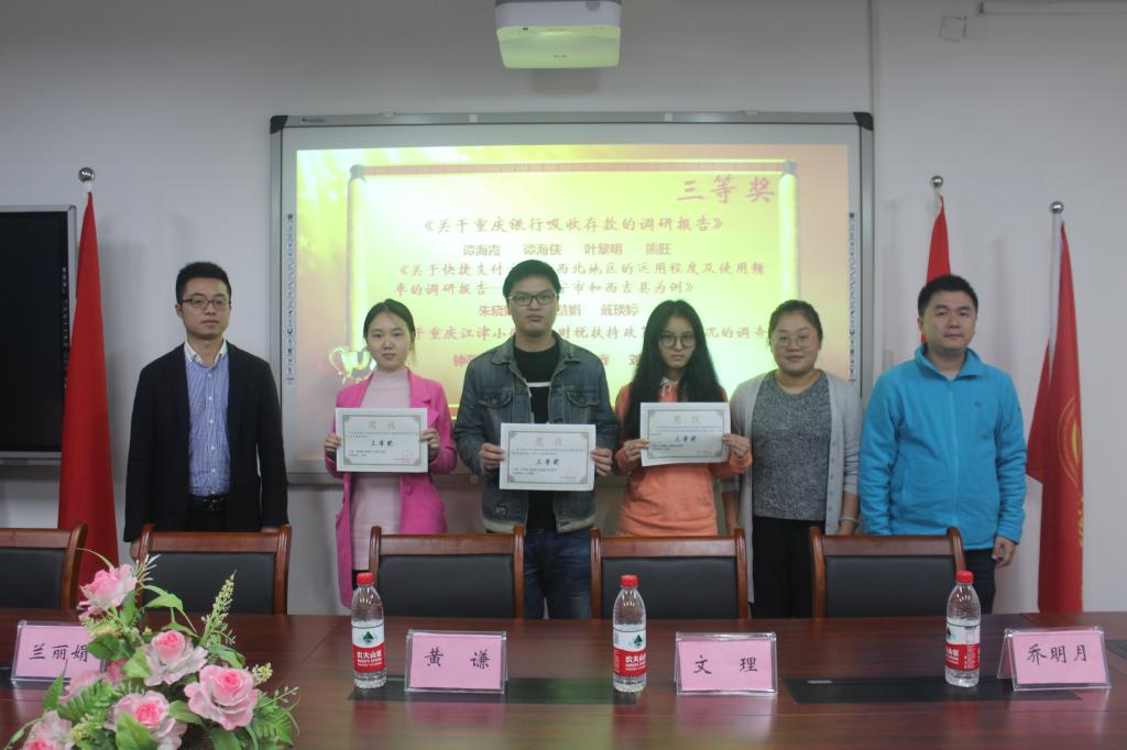 大会开始后,由黄谦书记发表致词,不仅肯定了同学们在社会实践调研中的成果,还对大家在以后的学习与实践中提出了中肯的建议:调研要深入基层,要选取合理的题目,涉及的范围不要太广,宏大的题目单凭几个人是不能够理解透彻的,最好的就是把调研做精做好。而后,优秀调研团队张帮满团队为我们详细讲解了他们团队的调研内容。他们就“保险意识与保险行业在重庆城乡的发展状况”这一问题进行了调研,深入了涪陵等地,通过采样调查等方法构建起自己的一套完整调研体系。最后,主持人揭晓了本次调研活动的获奖团队:张帮满团队荣获一等奖,梁炎兰团队和周万伦团队荣获二等奖,谭海霞团队、朱晓娟团队以及钟亭亭团队荣获三等奖,由出席的各位领导和老师为获奖的优秀团队颁发奖状。