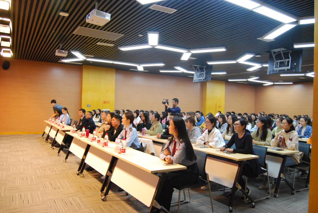 宣讲会开始后,韩健老师上台致辞。他引用孟子的话“徒善不足以为政,徒法不能以自行”,教导我们不仅要学习税法知识,更重要的是要培养税法思维,让税法思维融入到生活和工作中。随后重庆税收普法宣讲团成员、涪陵区税务局马晓敏老师和重庆税收普法宣讲团成员、重庆市第七稽查局何冰翊老师分别向同学们介绍了关于发票的“套路”和税务稽查的“前世今生”。何冰翊老师称: 纳税道路千万条,诚信纳税第一条;涉税行为不规范,亲人朋友两行泪。劝解同学们要诚信纳税。劳动模范、巴渝工匠、国家高级刺绣师、重庆税收志愿者单大琼老师为我们分享了她自己与税收有关的创业故事。我们的学姐、英国365集团公司优秀毕业生、南岸区税务局的宋雅洁也来到现场,与我们分享她在税务系统工作的感受。宣讲会在程羿老师致辞中落下帷幕。