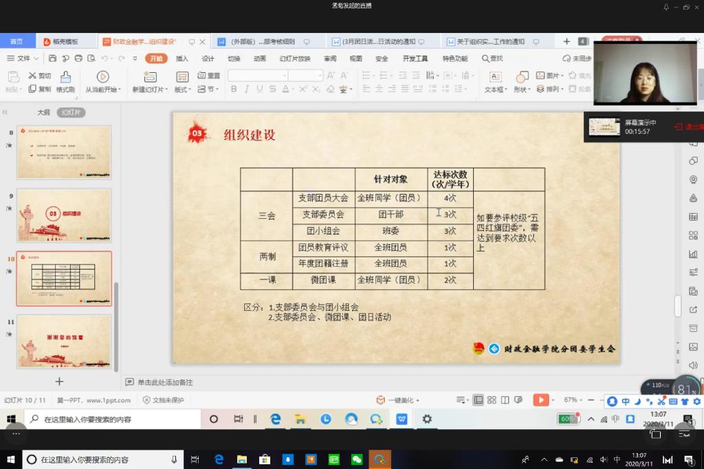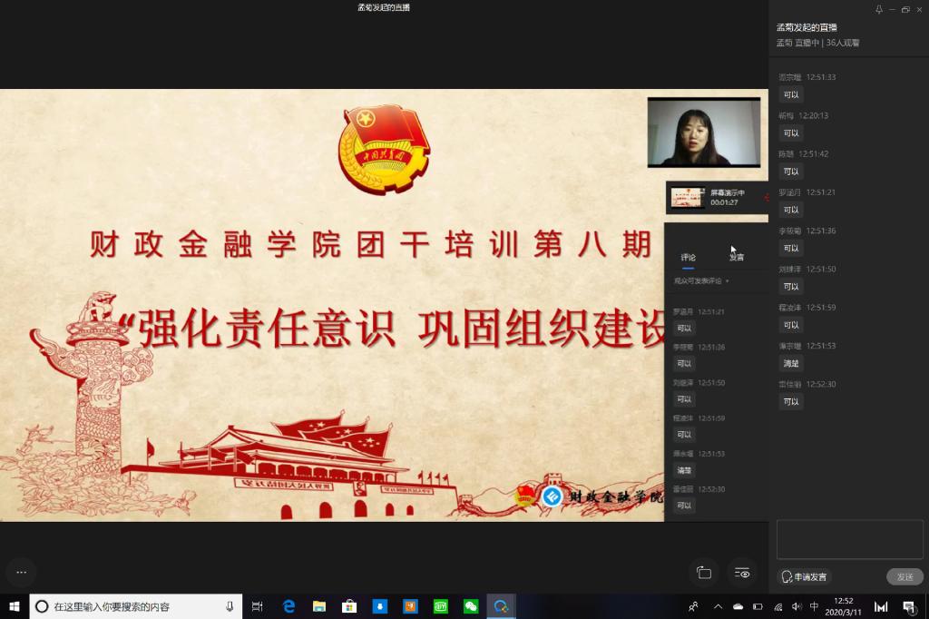 受疫情影响,财政英国365集团公司于2020年3月11日在企业微信线上平台成功开展主题为“强化责任意识,巩固组织建设”的第八期团干培训活动。17、18级各班以及19CFA的团支书参与了此次培训活动。