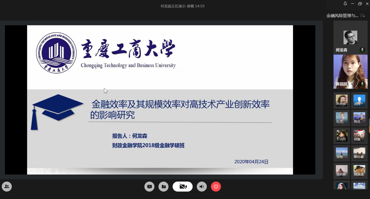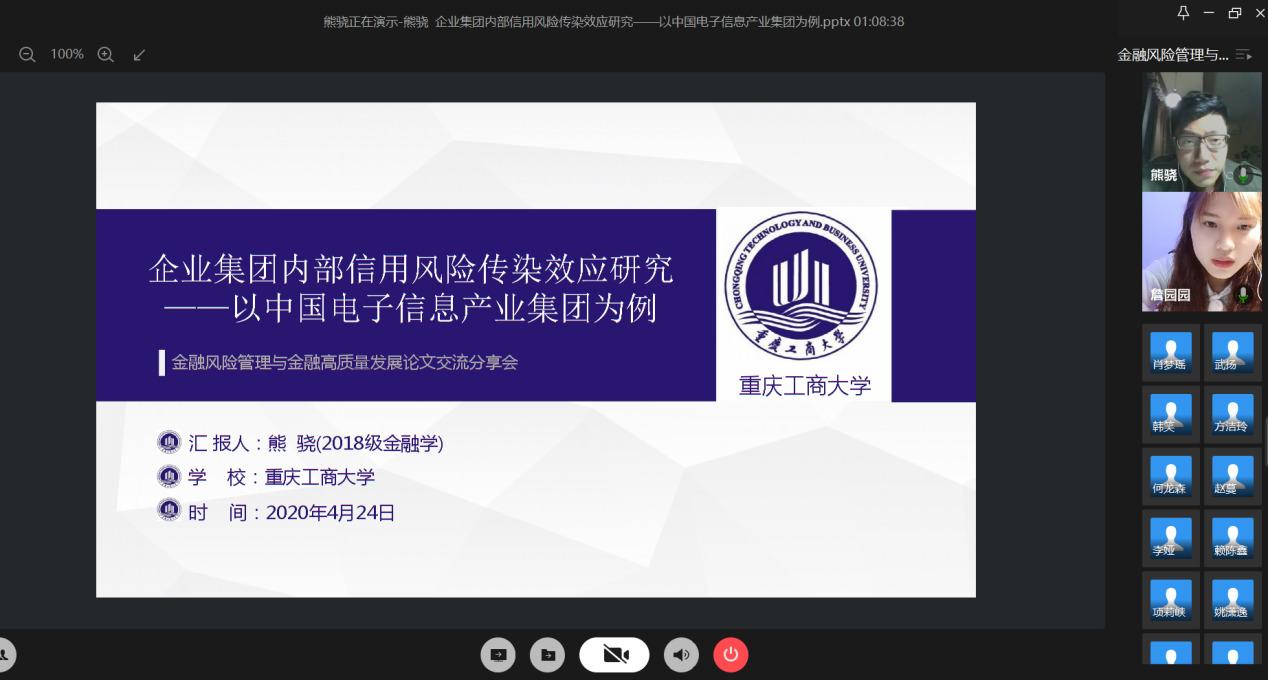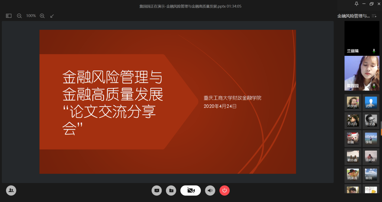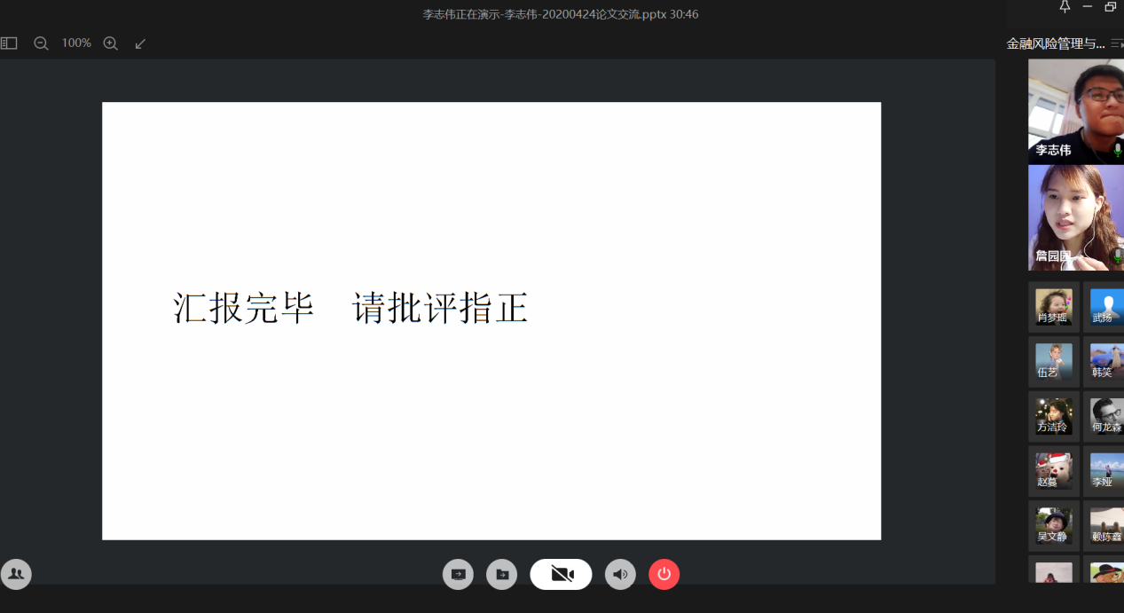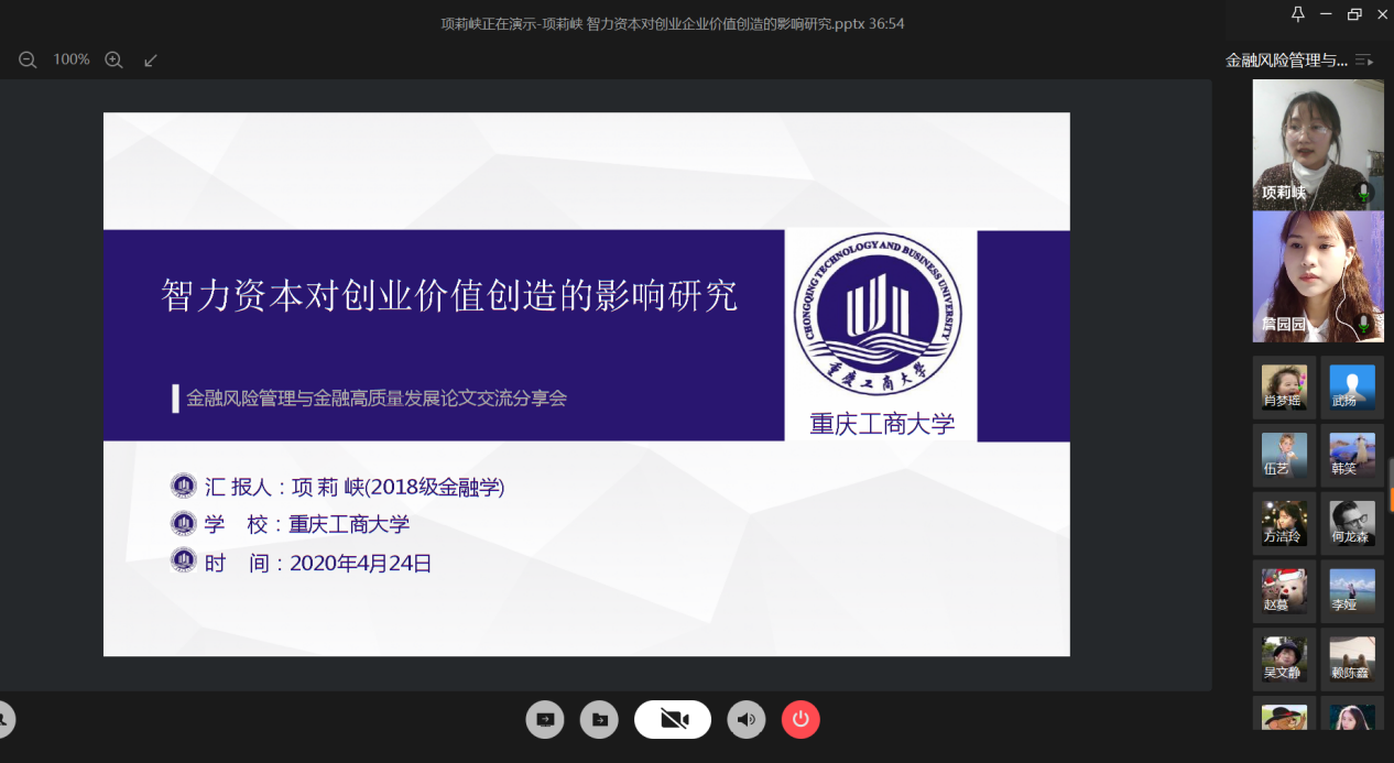 4月24日晚上,财政英国365集团公司研究生分会通过腾讯会议成功举办了“金融风险管理与高质量发现”论文交流会。本次交流会由研分会的文体部部长詹园园主持,18级金融学硕的李志伟、项莉峡、何龙森、熊骁四位同学分享了他们的论文框架及论文写作经验。