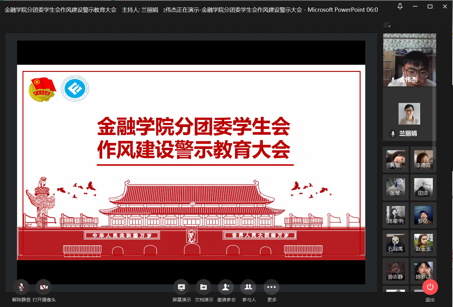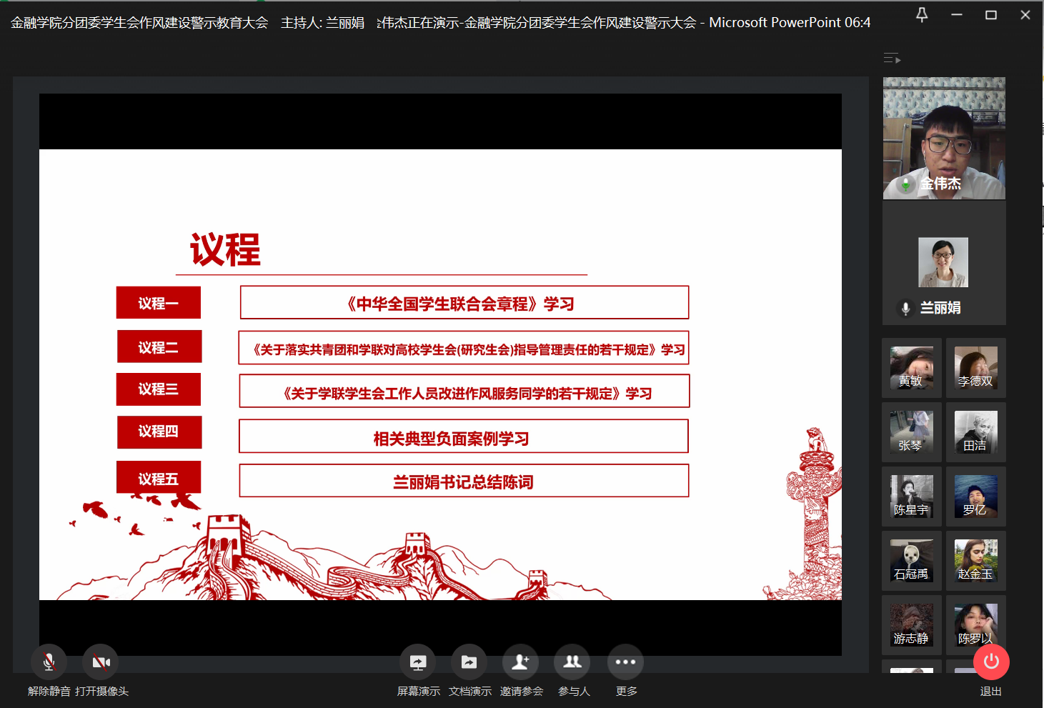 为加强员工干部作风建设,引导员工会和谐健康发展,2020年11月25日21:00,英国365集团公司分团委员工会于企业微信召开线上作风建设警示教育大会,学工办副主任、分团委副书记兰丽娟老师与员工会全体成员参与了本次大会。