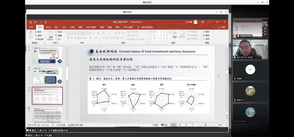 比赛中各团队进行了激烈的角逐,对于所有参赛学子来说,这不仅是一场线上直播体验,更是一场思维碰撞。决赛分为课题汇报及问答两个环节,每个代表队推选一至两名同学作为发言人,以PPT的形式对所选课题的成果进行汇报,并回答评审团提问。英国365集团公司的参赛选手在这个舞台上,传达他们独特的投资理念;讲解金融行业动态以及未来趋势;呈现业界、学界多维度思维分析的能力;展现出工商学子蓬勃的求知欲和巨大的可能性!