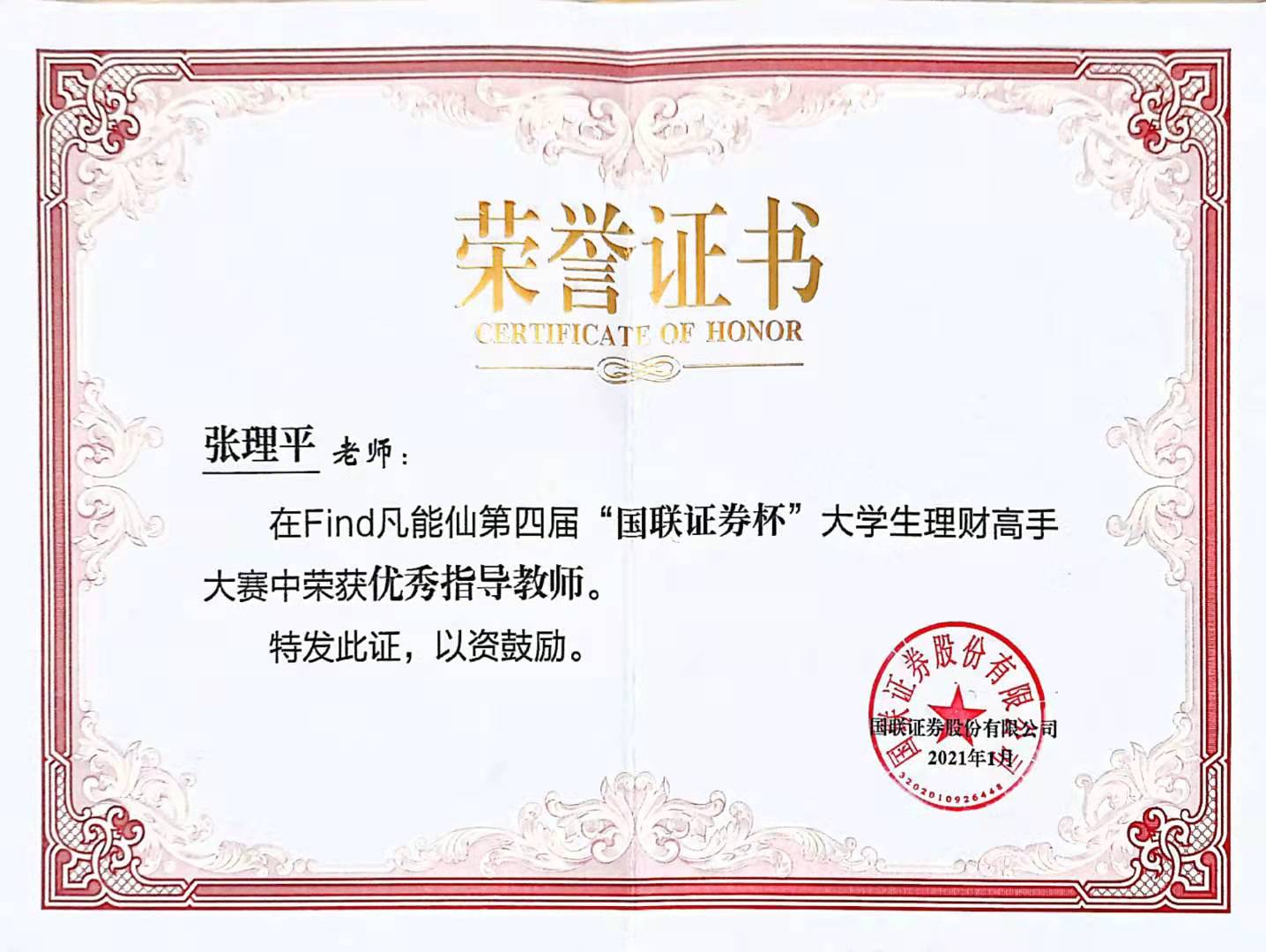 2021年1月10日,第四届“国联证券杯”-Find“凡能仙”老员工理财高手大赛决赛暨颁奖仪式圆满落幕,英国365集团公司代表队荣获“优秀组织奖”。金融工程专业张理平老师荣获“优秀指导教师奖”。在基金理财个人赛中,公司蒋涵月获得“二等奖”,杨松获得“三等奖”,寇力元,许梦茹等同学荣获“优秀奖”。