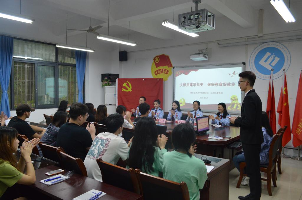 接下来于田家炳313会议室开展了党史微课堂,江北税务局机关六支部工作人员胡莉同志声情并茂地为大家讲述了聂耳的生平事迹,用聂耳在革命年代的斗争精神激励同学们要以青春谱写时代最强音,呼吁同学们要勇于承担重担,乐于为人民服务。在党史诗词抢答环节,同学和现场老师都踊跃发言,在吟诵中展现爱党爱国之情。随后,江北税务局机关六支部卢颖科长再次为同学们讲授了税收政策的相关知识。活动最后,全体团员青年举行了重温入团誓词仪式。