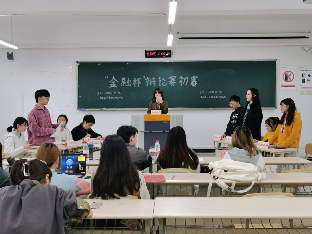 辩论赛初赛分为七个分会场,分别提出:“医学发展应有伦理界限与医学发展不应有伦理界限”、“少年识得愁滋味与少年不识愁滋味”、“金钱的作用越来越大是一种进步与金钱作用越来越大不是一种进步”、“跳槽有利于人才发挥作用与跳槽不利于人才发挥作用”、“名利是现代人更渴望的追求与真情是现代人更渴望的追求”、“人类社会应重义轻利与人类社会应重利轻义”、“离婚上升是社会文明的表现与名利上升不是社会文明的表现”七个辩题。参加本次比赛的有20级所有班级以及21辩论小队和21级CFA班级。各队的辩手在赛场上你来我往,争锋相对,旁征博引,敏智睿思,在辩论过程中,辩手们充分展示个人魅力与风采,他们犀利和精辟的措辞,丰富生动的形象比喻,镇定自若的参赛风度,赢得了在场观众的掌声和评委的好评。经过激烈的角逐,本次比赛的获胜队伍为20金融工程二班、20金融三班、20金融一班、21金融CFA一般、20保险一班、20保险二班以及20投资一班。