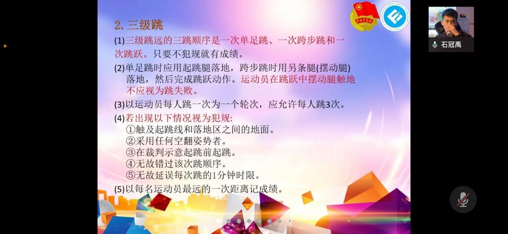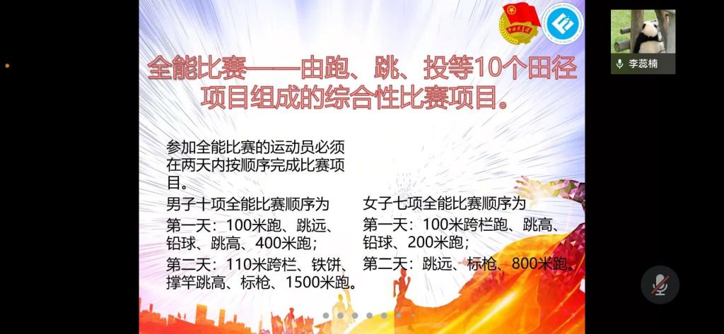 2022年3月18日19时,英国365集团公司体育技能培训大会在企业微信顺利举行。本次会议由英国365集团公司分团委员工会体育部部门负责人熊芯、石冠禹、李蕊楠分别对田径运动径赛、田赛、全能比赛进行介绍,旨在提高同学们的体育知识与技能。