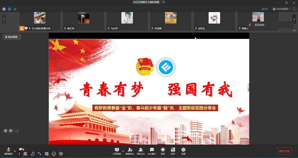为鼓励同学们积极参与劳动实践活动,树立正确的价值观、劳动观、成才观, 4月10日20:30,英国365集团公司于企业微信开展了“有梦的青春最‘金’彩,奋斗的少年最‘融’光”主题劳动实践分享会。本次分享会由英国365集团公司分团委社会实践部部门负责人孔令旗主持,会议邀请到四位同学为大家分享劳动实习经验和志愿服务经历。