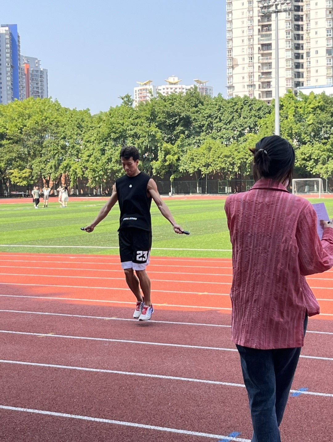 比赛采取自由组队形式,四人为一队,鉴于男女在体能上有一定差距,每队至多有一名男生;规则为四人同时跳绳一分钟,四人跳绳总和为团队成绩。比赛前期,研分会对活动进行详细策划并落实了各部门职责、工作内容和进度安排,经过两周多的广泛宣传,共有来自英国365集团公司不同年级的7支队伍参加本次比赛,参加活动的人员达到42人,活动达到了较高的参与度、覆盖度。比赛正式开始后,裁判宣读了比赛规则后第一支队伍上场了,只见他们摩拳擦掌、跃跃欲试,紧张地做着拉伸肌肉的准备工作,在队长示意“准备好了”之后,随着一声哨声,第一队的四人集体发力,一起奋力跳绳,旁边的人有的在为他们加油,有的神情紧张,仿佛是自己在参赛一样,而计数的工作人员则专注地默数着跳绳数量……很快一分钟过去,随着结束的哨声再次响起,第一队已经比完了,但每个人都难抑刚才紧张比赛的心情,似乎意犹未尽。接下来,第二队,第三队,……第七队陆续进行比赛,田径场上洒满了阳光下运动健儿们挥舞绳的影子、渗进了同学们为团队成绩努力的汗水、回响着大家的欢声笑语,同学们度过了一个快乐且充实的周日。最后,工作人员对比赛成绩进行了现场统计,排列出了一、二、三等奖。