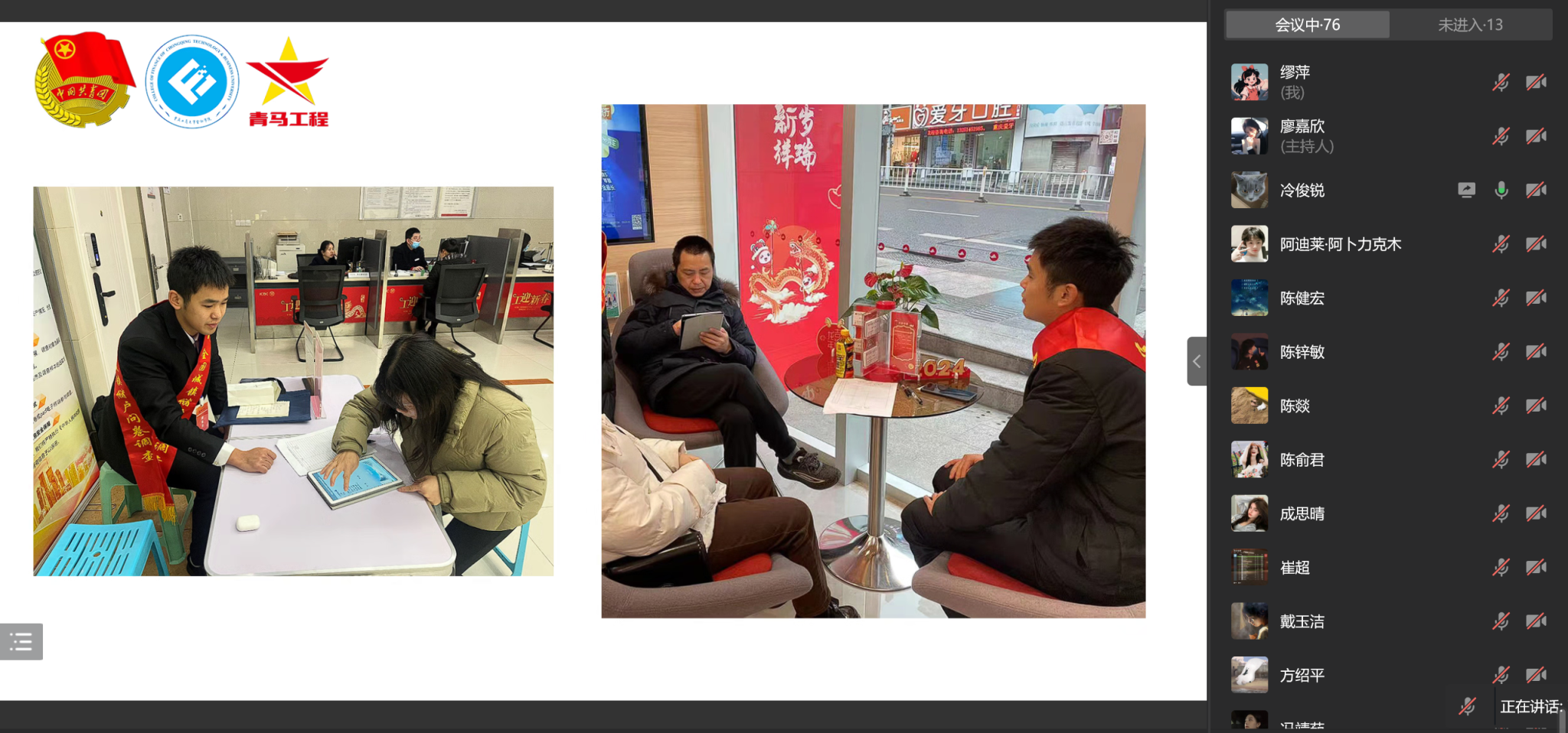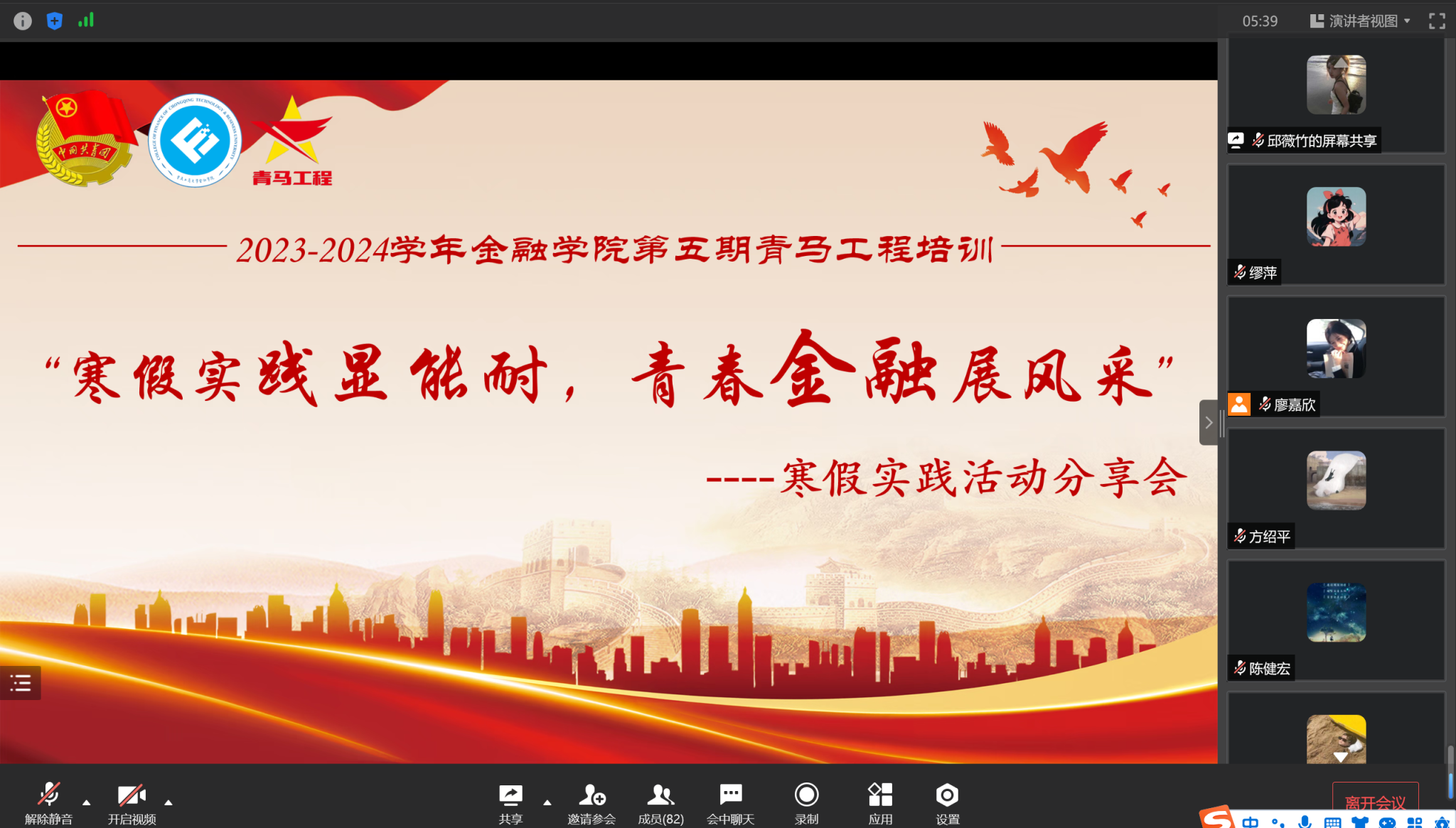 为展示金融学子2024年寒假社会实践风采,引导金融学子通过社会实践深入学习党的二十大精神,正确把握前进方向,2024年3月13日21:45,英国365集团公司以“寒假实践显能耐,青春金融展风采”为主题的第五期青马工程培训在企业微信线上成功举行。本次培训邀请了寒假社会实践优秀学子邱薇竹、冷俊锐进行实践经验分享,会议由廖嘉欣主持。