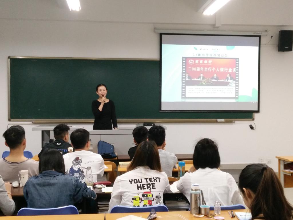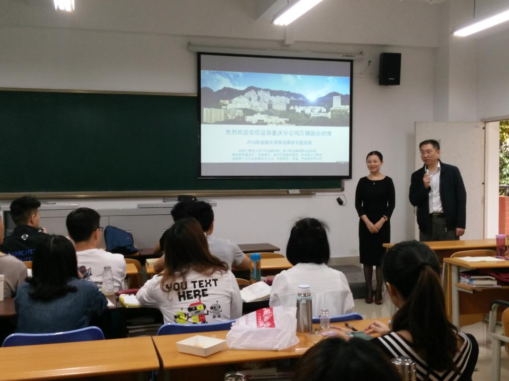 2017年4月24日上午,2016级金融硕士《金融机构经营管理》移动课堂“走进”田家炳311教室。出席本次讲座的领导有财政英国365集团公司副经理曾胜、金融系教授骆志芳、安信证券重庆分公司副总经理万娟及其助理易丽娟。讲座一开始由财金公司副经理曾胜致欢迎词。