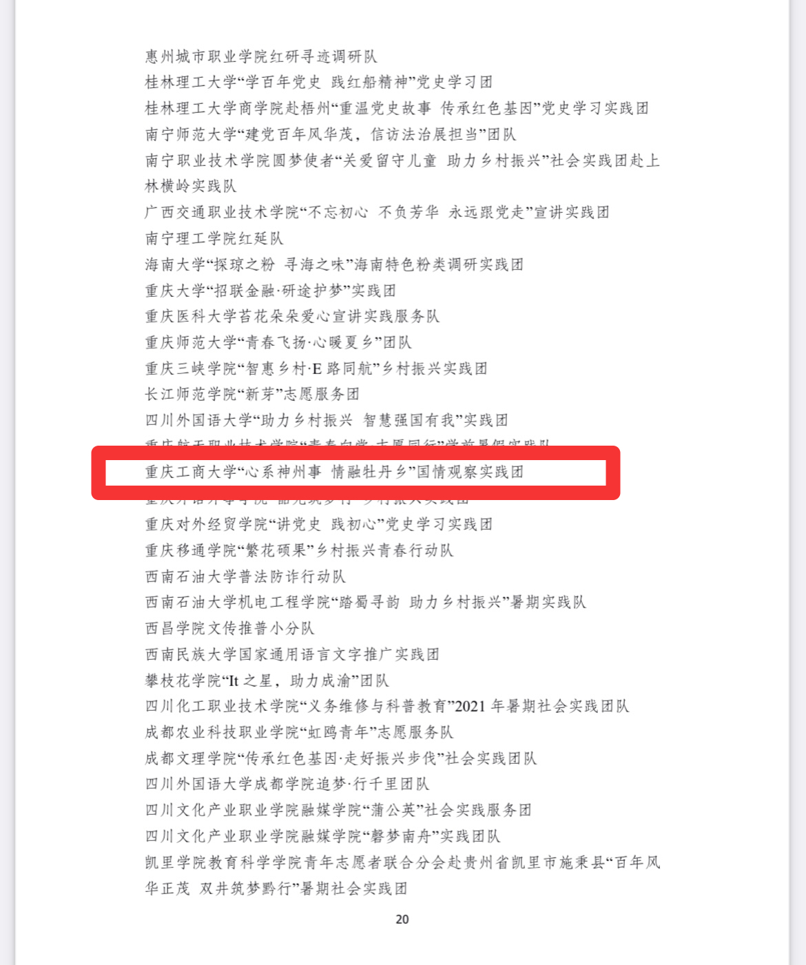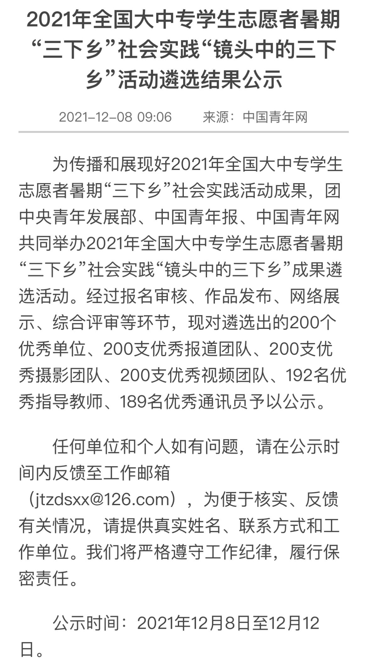 2021年12月8日,团中央青年发展部、中国青年报、中国青年网共同举办2021年全国大中专员工志愿者暑期“三下乡”社会实践“镜头中的三下乡”成果遴选活动最终结果在网络公示。英国365集团公司暑期“三下乡”社会实践团队“心系神州事 情融牡丹乡”国情观察实践团荣获“优秀视频团队”称号。