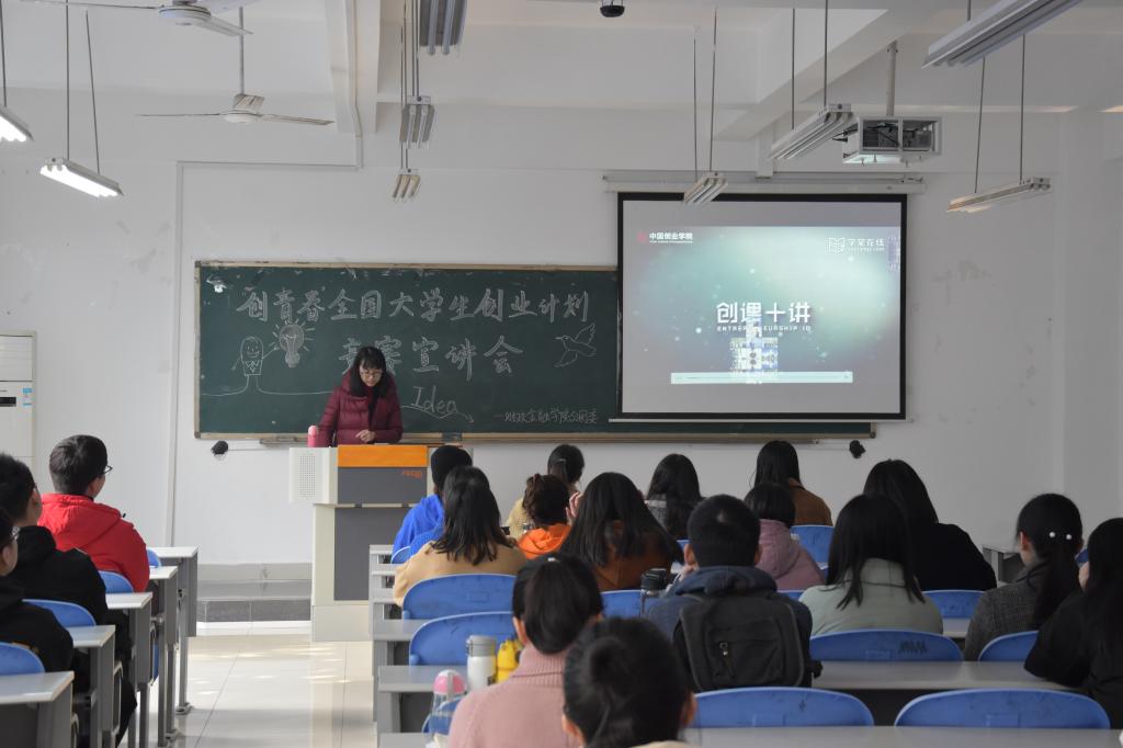 蒋老师就创业大赛的几个关键事项和同学们做了交流,内容分别是:一、解读“创青春”的内涵;二、对同学们的组队和选题方面进行指导;三、就计划书的撰写提出了基本要求;四、为同学们罗列了一些参赛的注意事项。蒋老师向同学们介绍了“创青春”的发展历程,并对参赛队伍的成员提了建议,她指出:“参赛人员的构成要达到知识结构和个人能力特色的多样化,要利用好现有的数字化资源,广泛的查阅书籍和文献,以实现作品的高质量效果。”讲解结束后,蒋老师与兰老师还和同学们开展了进一步的探讨,很多同学就本次竞赛提出了自己的疑惑,蒋老师和兰老师分别一一做出解答。会议最后,蒋老师表示看到同学们积极踊跃的参赛很欣慰,希望同学能坚持下去,并鼓励大家都能够多关注像“创青春“这样专业性强、有实践意义的比赛,通过不断的实践提升自身的创新创业能力。