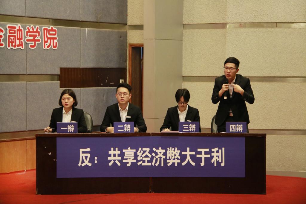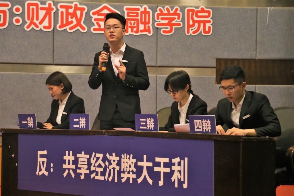 进入决赛的是财政英国365集团公司辩论队与环境与资源公司辩论队。双方就“共享经济利大于弊/弊大于利”展开辩论。比赛伊始,作为正方的环境与资源公司开宗明义,通过分析市场现状和共享经济发展趋势阐明了“共享经济利大于弊”的观点。我方辩手则提出了共享经济会提高社会成本,占用社会资源的观点,并从另外一个角度剖析共享经济的蓬勃发展容易导致恶性竞争从而破坏市场规则,影响经济的正常运行,进而论证了“共享经济弊大于利”的论点。在随后的自由辩论与总结陈词环节,双方辩手你来我往、旁征博引,以沉稳冷静、妙语连珠的表现获得了在场观众与评委的阵阵掌声。